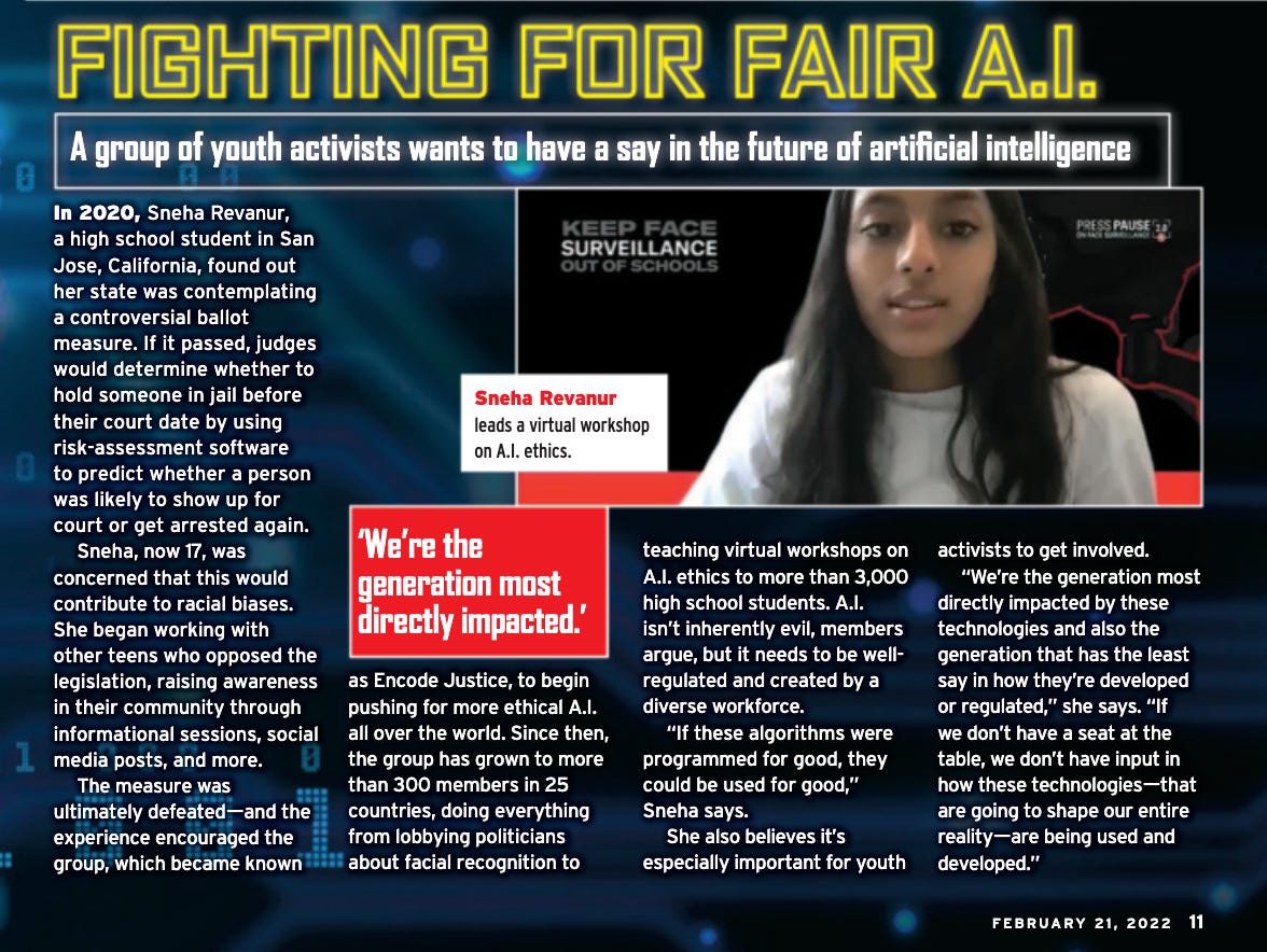 This week, we wrapped up a series of workshops as part of a Black History Month program at Brooklyn Technical High School in New York City. Now, we’ll be piloting a junior fellowship program in partnership with two middle schools in Georgia. Over the course of a six- to eight-week timeline, younger students will engage in disruptive conversations that explore themes like innovation and justice—along the way, they’ll prepare for an end-of-program symposium, where they’ll present personal research projects on a AI policy topic of their choice. Upon graduation from the program, they’ll be inducted into the Encode Justice family as its youngest members!